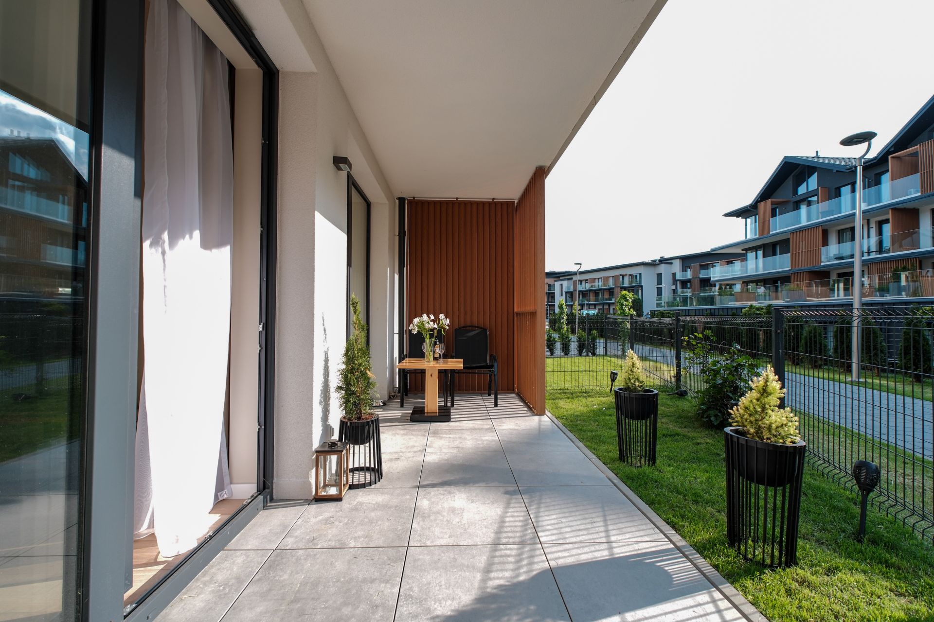 Taras to olbrzymi atut tego apartamentu - po otwarciu okna wychodzimy na przepiękny balkon, idealny na poranną kawę i relaks po wędrówkach.