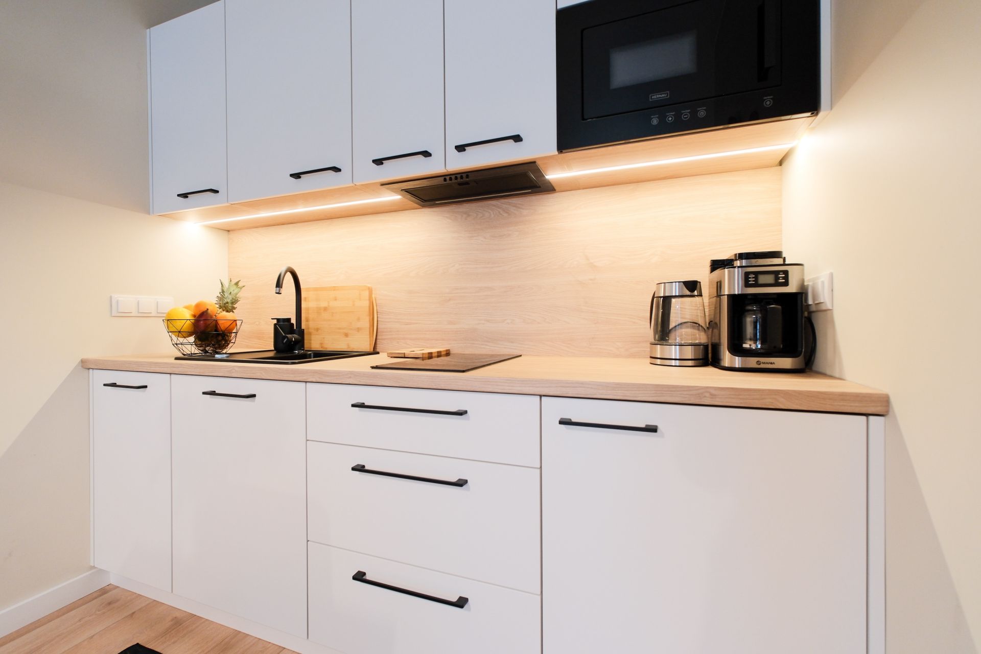 Kuchnia – połączona z salonem i w pełni wyposażona sprawi, że poczujesz się jak w domu. Do dyspozycji masz zmywarkę, płytę kuchenną i mikrofalówkę, lodówkę, czajnik elektryczny, ekspres do kawy. W kuchni znajdziesz zastawę stołową, sztućce, kubki, szklanki i kieliszki, patelnie, garnki, przybory kuchenne.