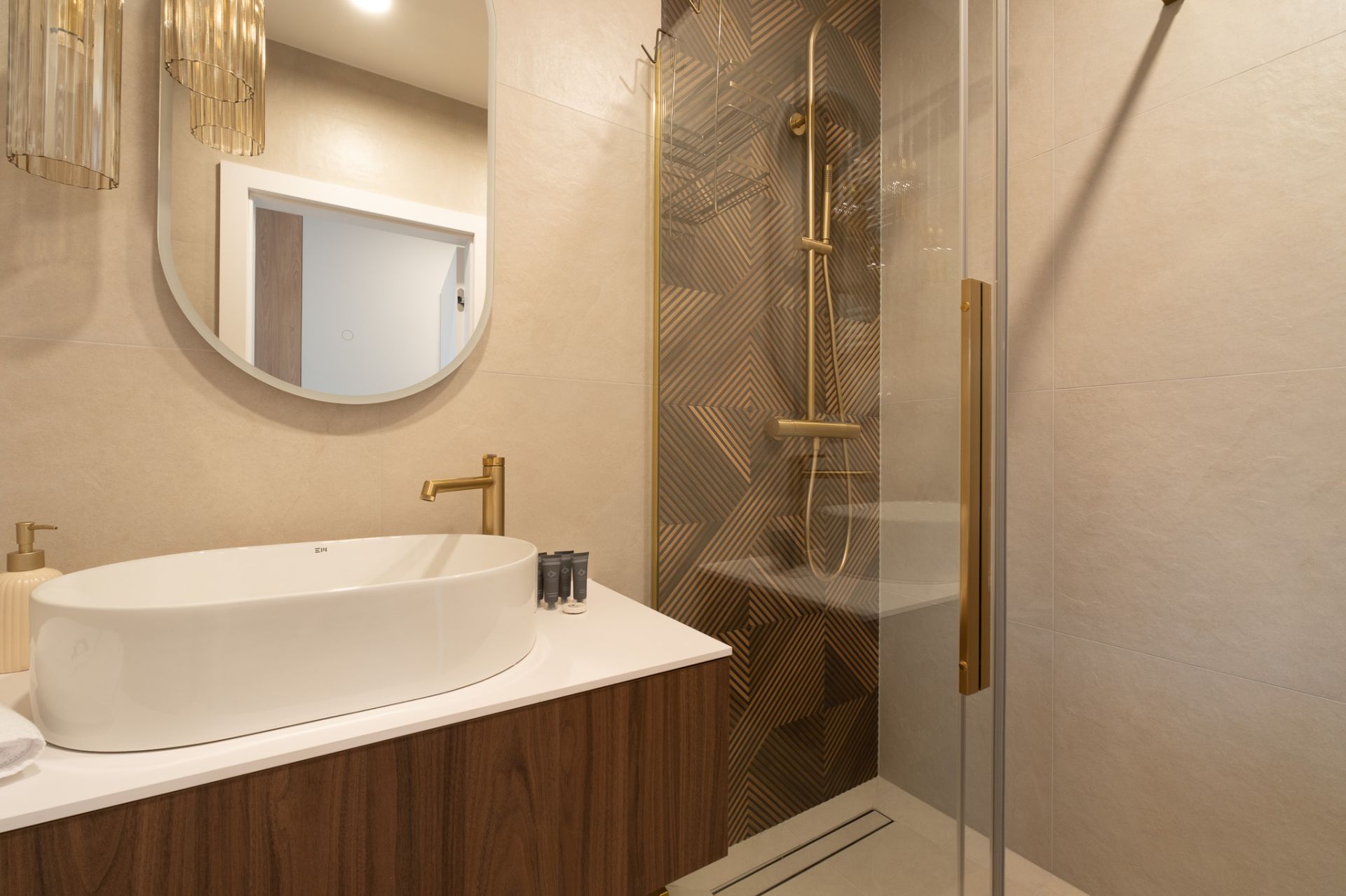 Łazienka – nowocześnie wykończona z prysznicem, suszarką do włosów, pralko-suszarką, ręcznikami. W apartamencie znajduje się zestaw mini kosmetyków.