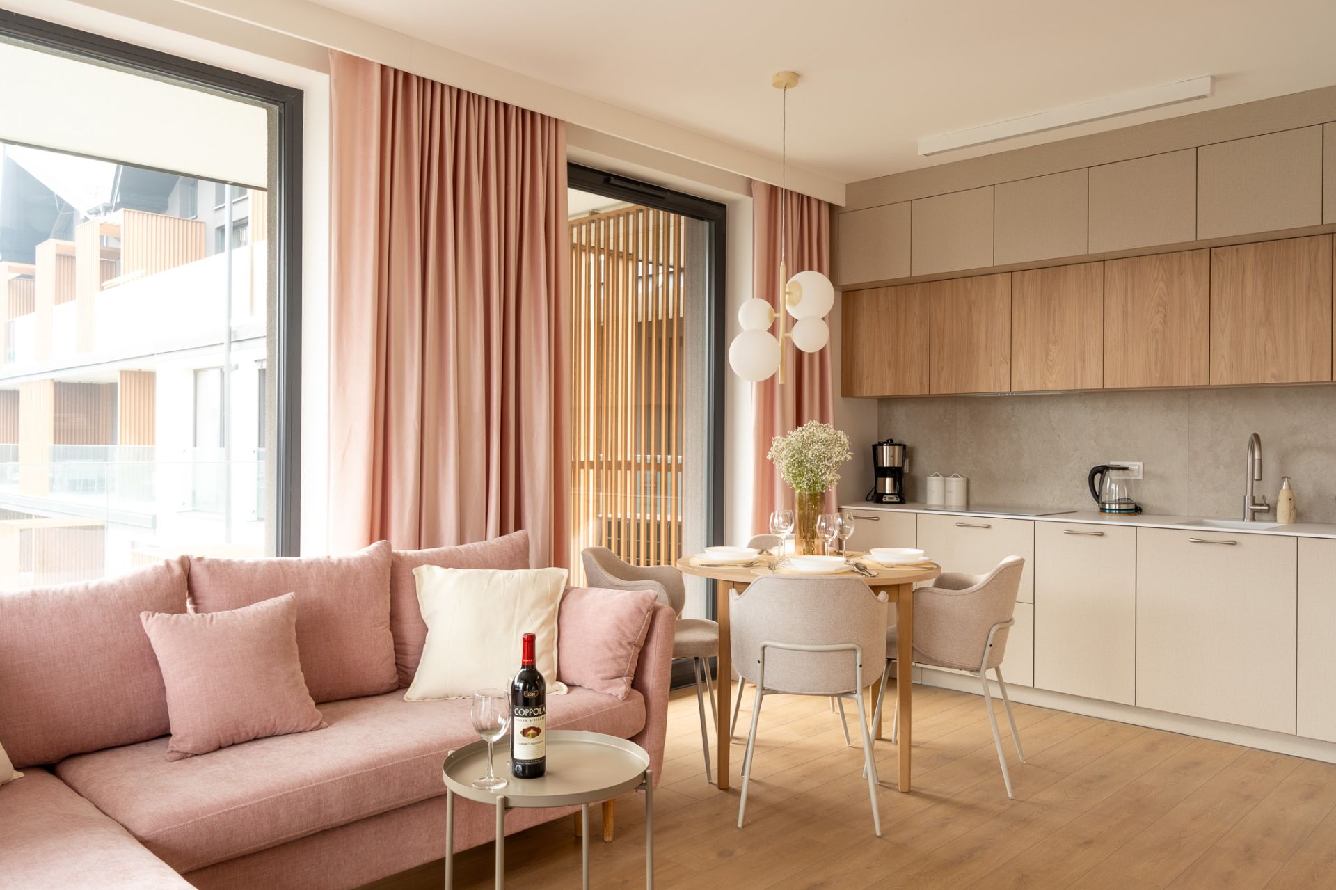 Apartament jest idealny dla 4 osób, ceniących wysoki standard i szukających dla siebie czegoś wyjątkowego. Wnętrze zostało zaprojektowanie z najwyższej klasy materiałów i z dbałością o każdy szczegół. Każdy pokój posiada wyjście na balkon ze widokiem na góry. Internet to szybkie połączenie światłowodowe, co pozwoli również na bezproblemową pracę zdalną!