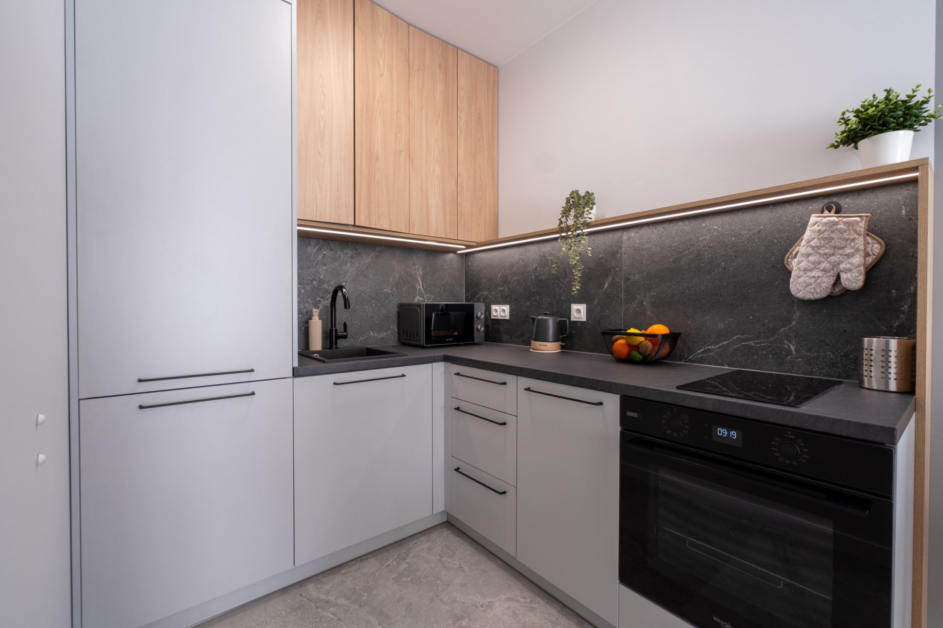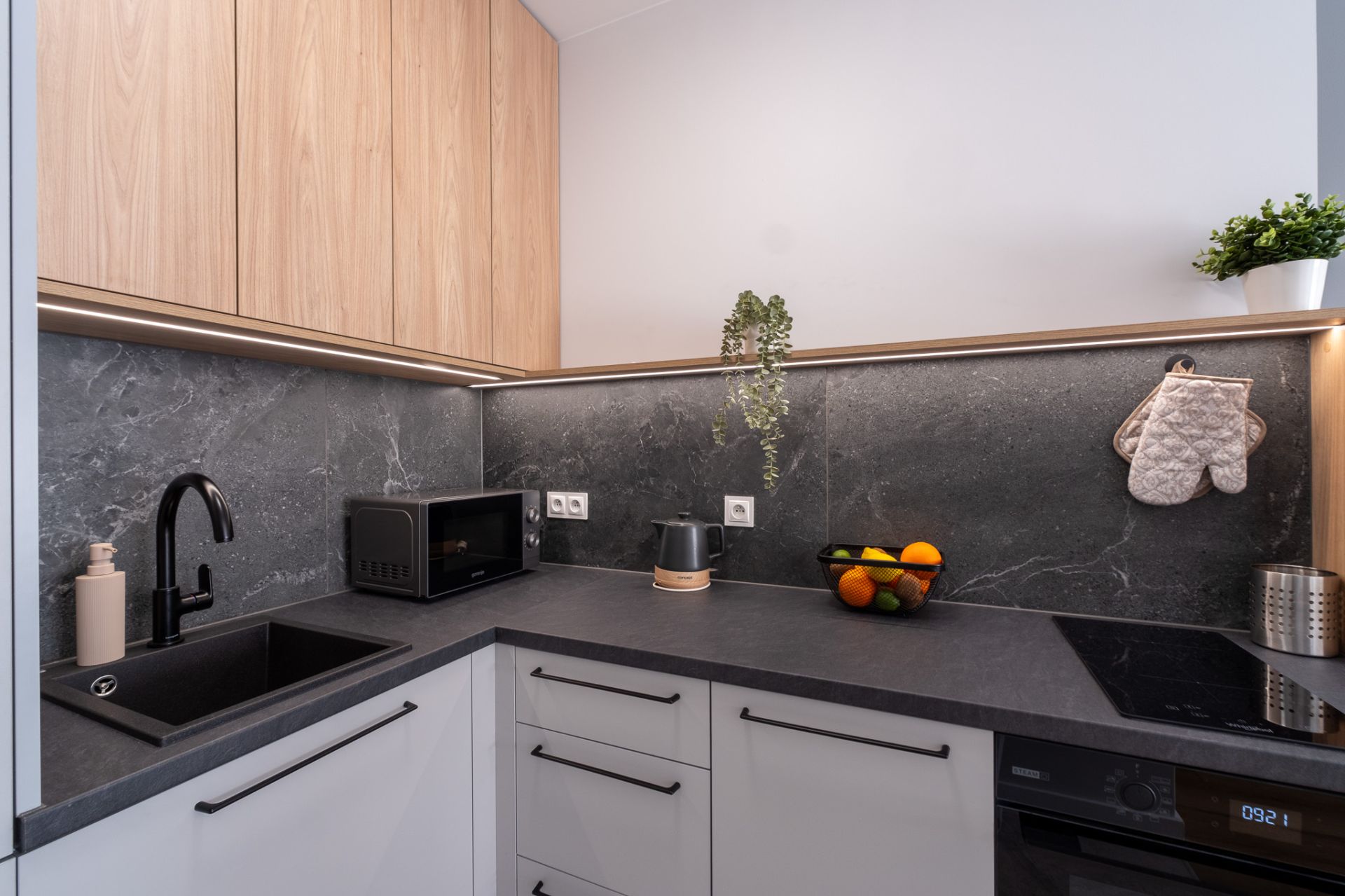 Kuchnia – połączona z salonem i w pełni wyposażona sprawi, że poczujesz się jak w domu. Do dyspozycji masz zmywarkę, płytę kuchenną i mikrofalówkę, lodówkę, czajnik elektryczny, ekspres do kawy. W kuchni znajdziesz zastawę stołową, sztućce, kubki, szklanki i kieliszki, patelnie, garnki, przybory kuchenne.