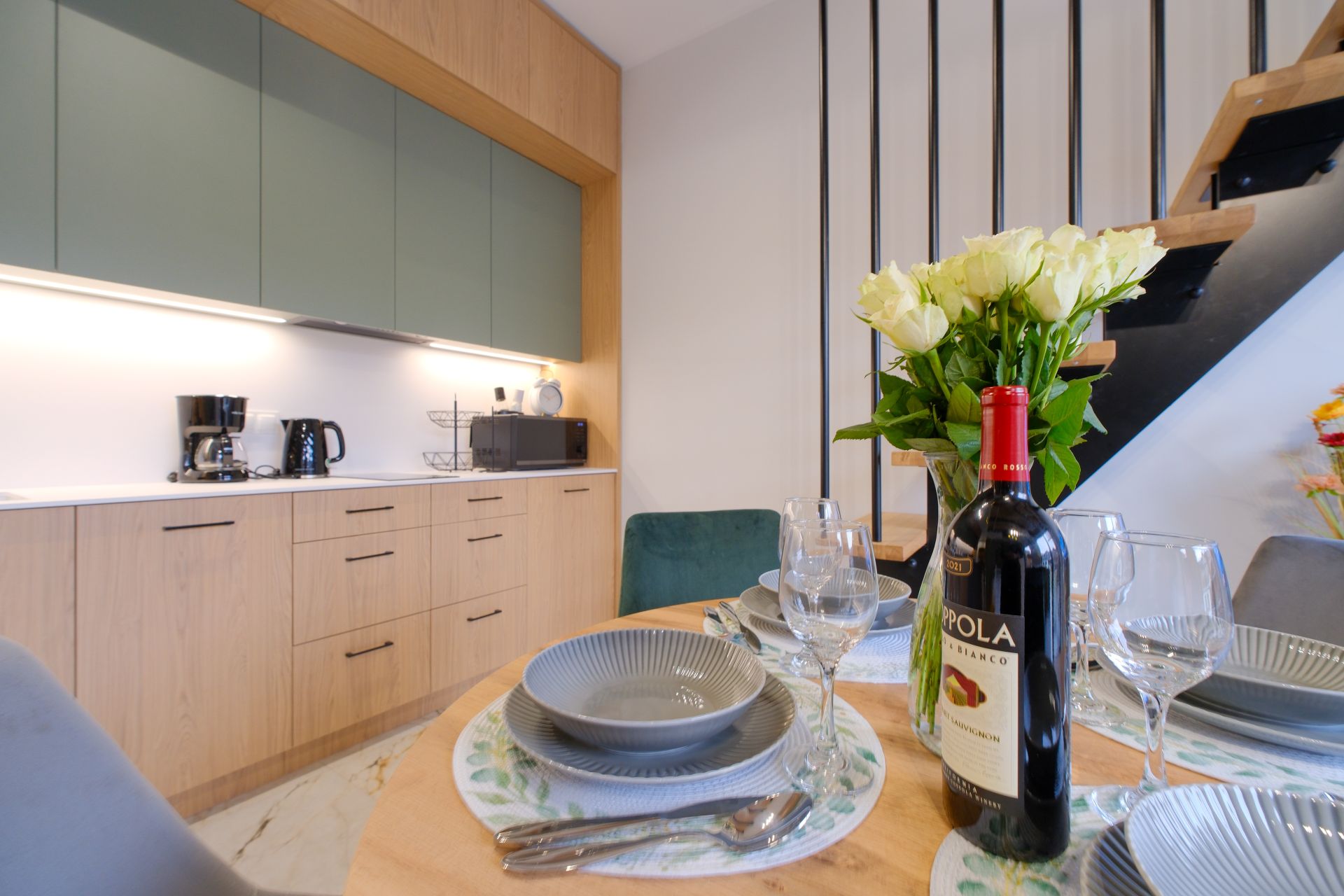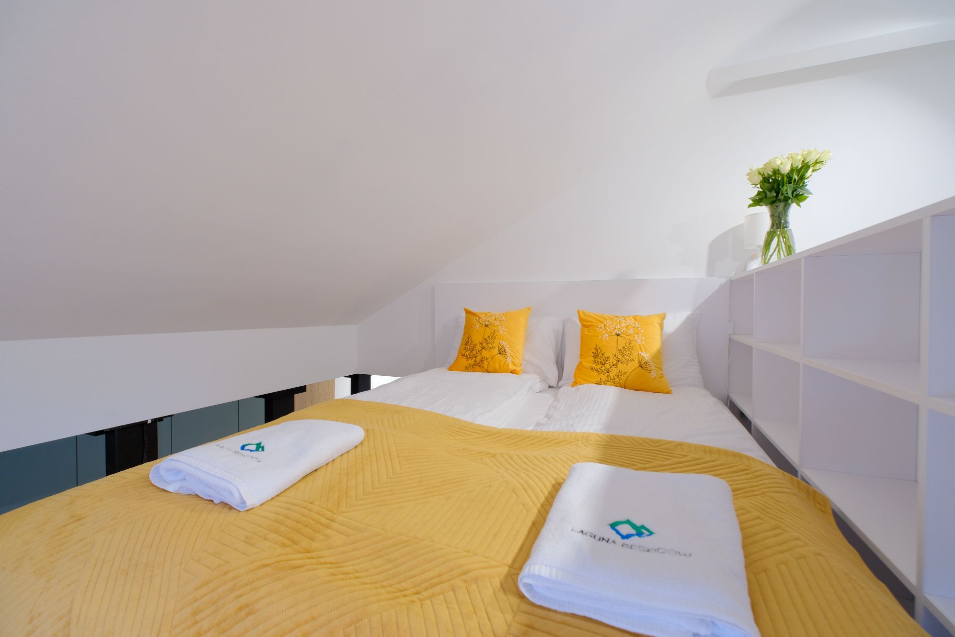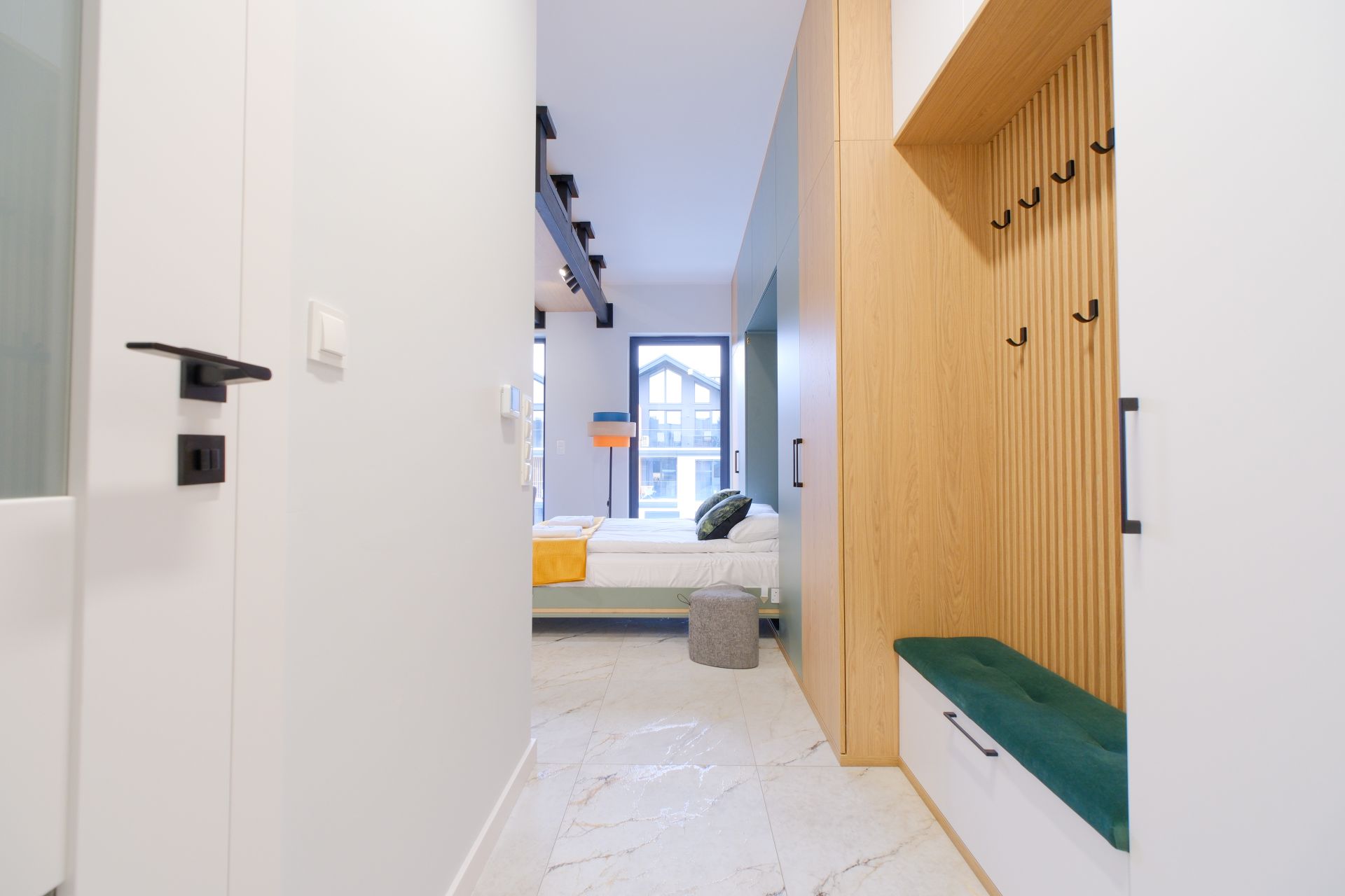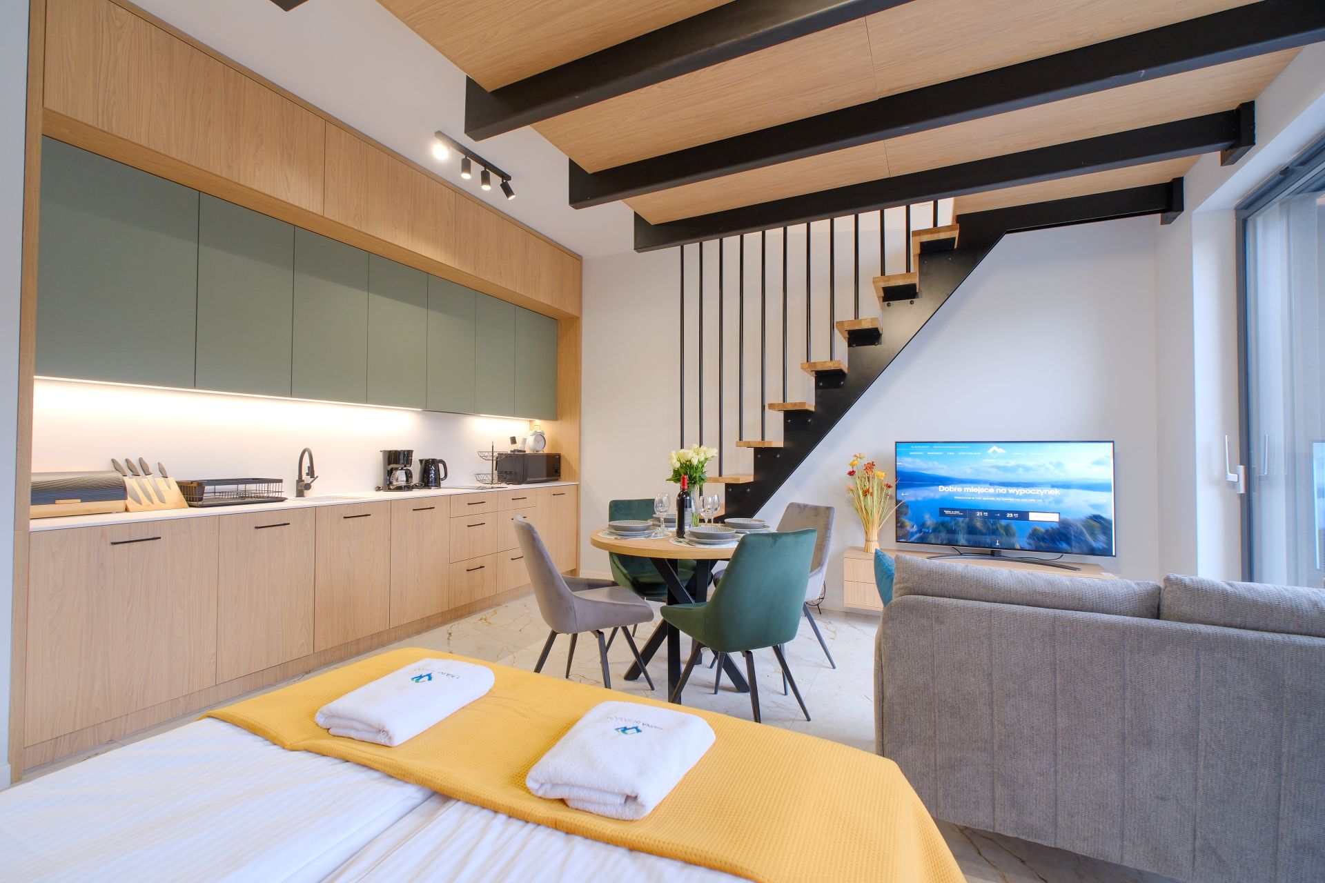W apartamencie czekają na Ciebie: antresola z wygodnym materacem, łóżko schowane w zabudowie dla większego komfortu i wykorzystania przestrzeni w ciągu aktywnego dnia, przestronny salon z częścią jadalnianą, w pełni wyposażona kuchnia oraz nowoczesna łazienka z zestawem kosmetyków.