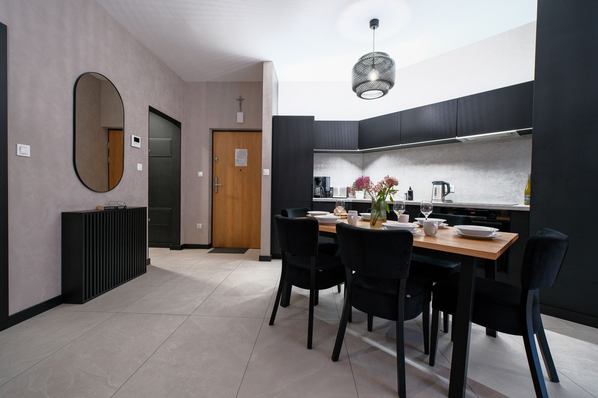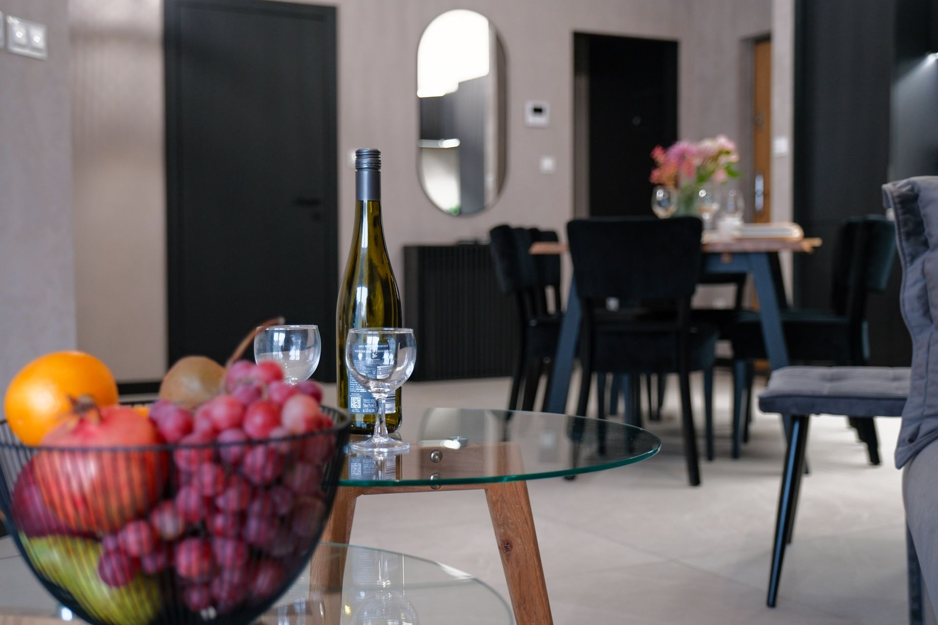 Salon – wyposażony w wygodną rozkładaną kanapę, fotel w stylu skandynawskim, stolik kawowy, stół z 6 krzesłami oraz smart TV. Salon posiada też wejście do garderoby!