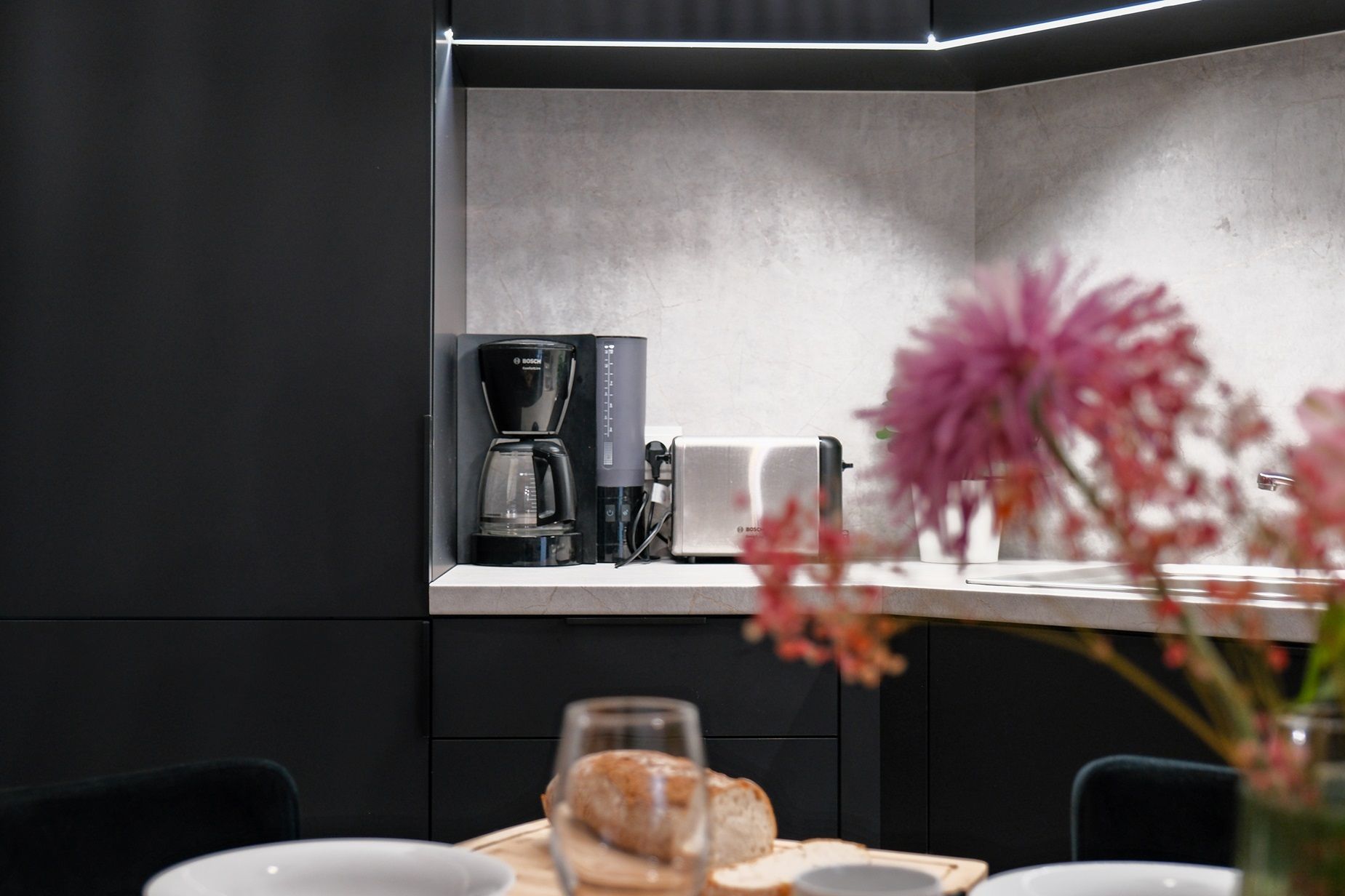 Kuchnia – połączona z salonem i w pełni wyposażona sprawi, że poczujesz się jak w domu. Do dyspozycji masz zmywarkę, płytę kuchenną i piekarnik, lodówkę, czajnik elektryczny, ekspres do kawy. W kuchni znajdziesz zastawę stołową, sztućce, kubki, szklanki i kieliszki, patelnie, garnki, przybory kuchenne.