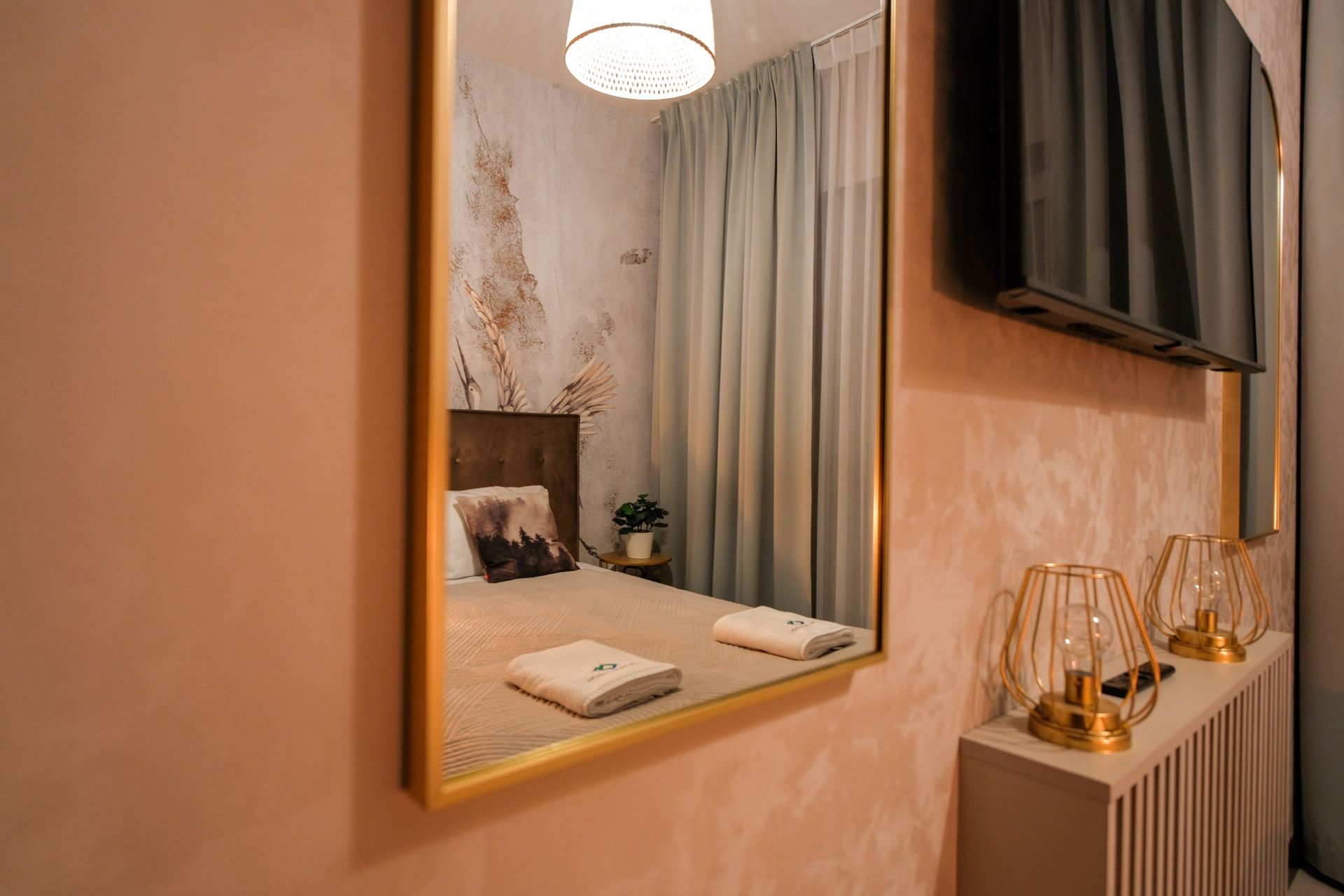 Sypialnia – z dużym wygodnym łóżkiem dla 2 osób i smart TV. Ubrania schowasz do szafy a wieczorne rytuały ułatwią szafki i lampki nocne.